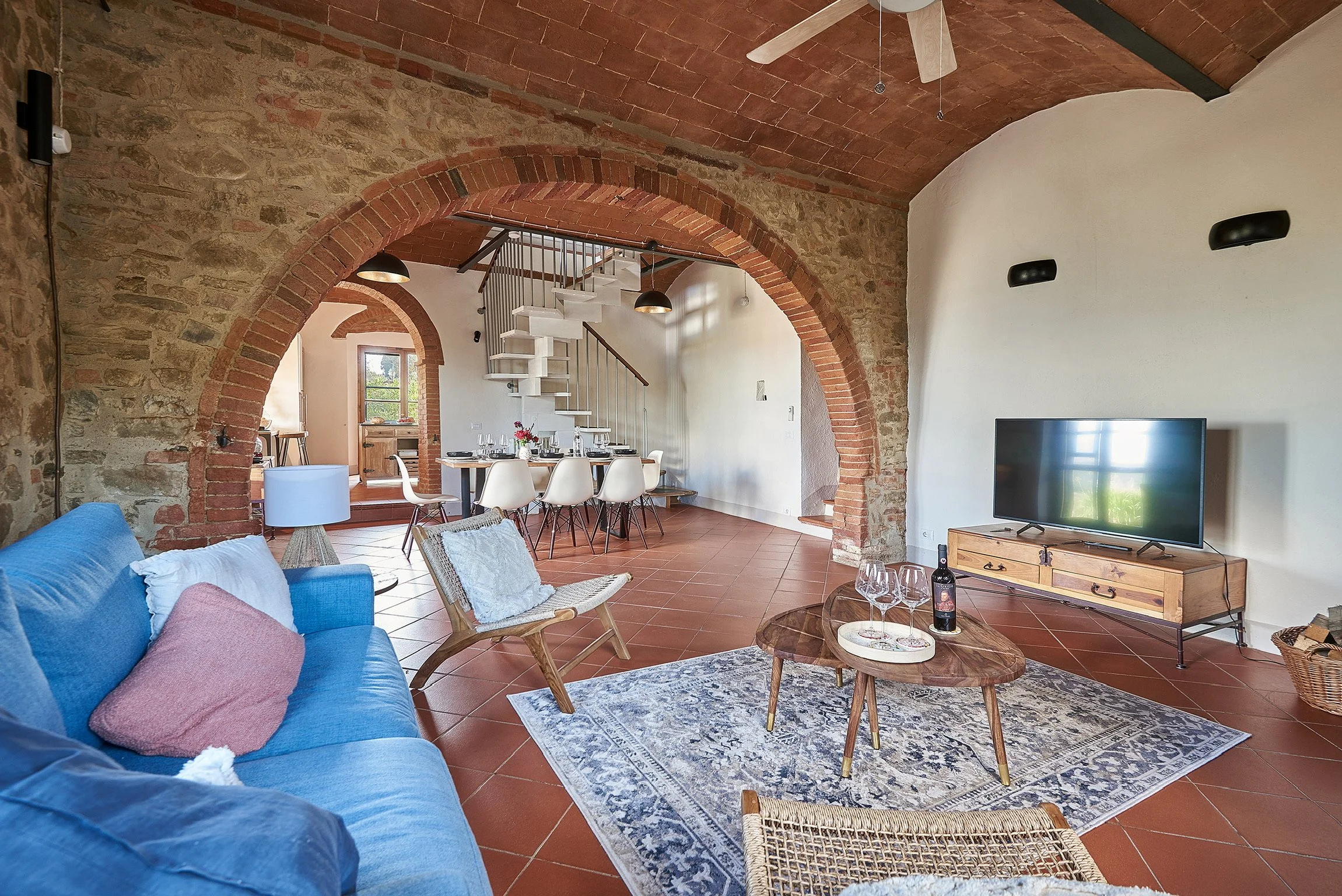 “On a site dating back to 1230 and tastefully restored, the property is bursting with character and original features that exude rustic charm. Enjoy the timeless beauty of terracotta tiled floors, vaulted ceilings, arches, chestnut timber beams, stone walls and cosy fireplaces. Traditional elements are effortlessly blended with contemporary furnishings, creating a relaxed and comfortable ambiance that perfectly embodies the Tuscan farmhouse style.”